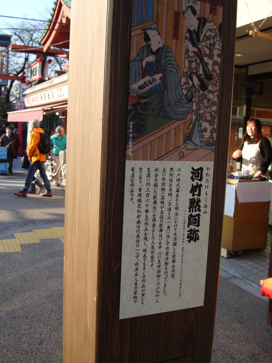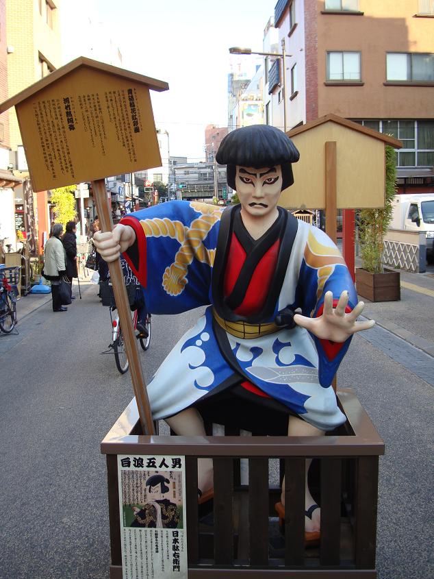 浅草は伝法院通りには、歌舞伎作家の河竹黙阿弥が、江戸時代末期にこの界隈に住み、執筆活動をしていたことを記念して、代表作の「白浪五人男」の人形がこの通りに飾られています。