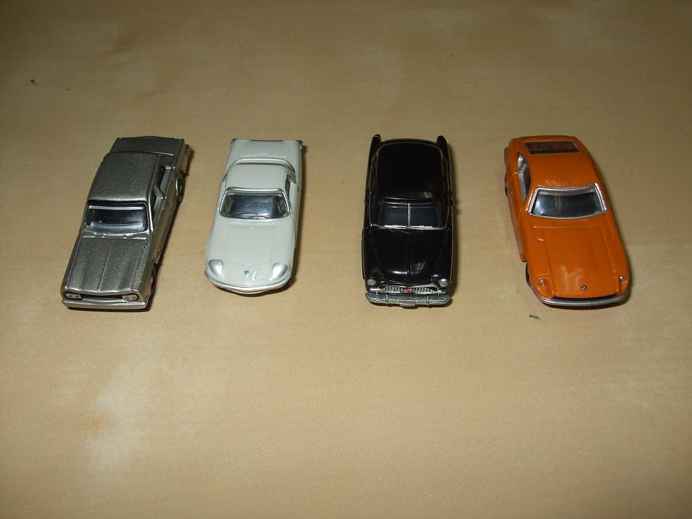 左から「スカイライン(ハコスカ)」「コスモスポーツ」「クラウン」「フェアレディZ」。