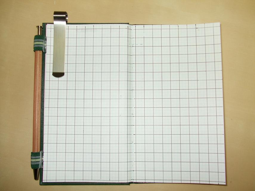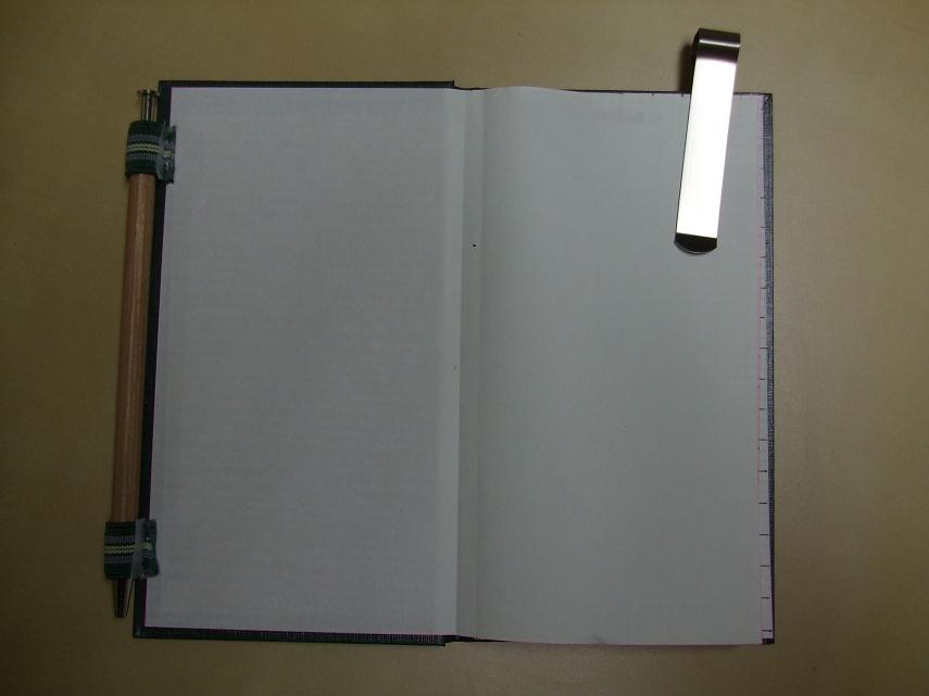 また、「ステンレス製マネークリップ」を表紙に刺していますが、これは、開いた時にしおり兼クリップとして使っています。(下記写真参照)