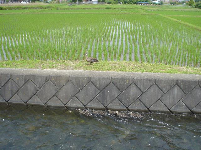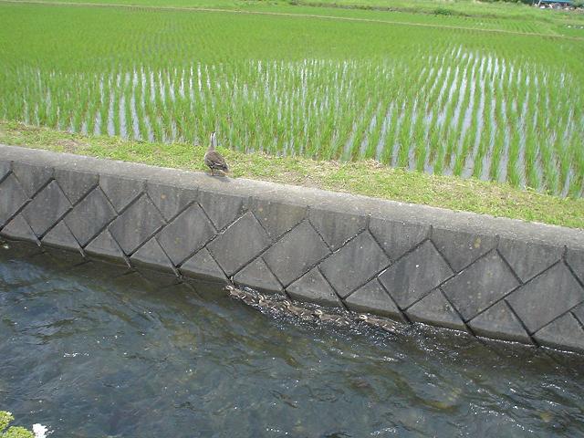 ちょうど、用水路で、ヒナが泳ぎの練習をしていました。