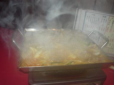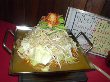 入っている具は、ホルモン系のお肉と、写真のような野菜を山盛りに、そして、頂上にキムチを載せたものをぐつぐつ煮込んでいただくという、「もつ鍋」に似たお鍋です。