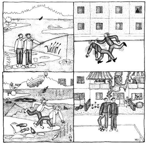 いろいろ建物に変化があって、バルコニーに花や緑があるような街の風景が描いてあって気持ちいいですね、と書いてある。いやな街というのは、全部同じ形の四角の建物があって、モスクワ郊外みたいに、四角い窓が規則正しく並んだ街で、こんな街はいやですねと書いてある。